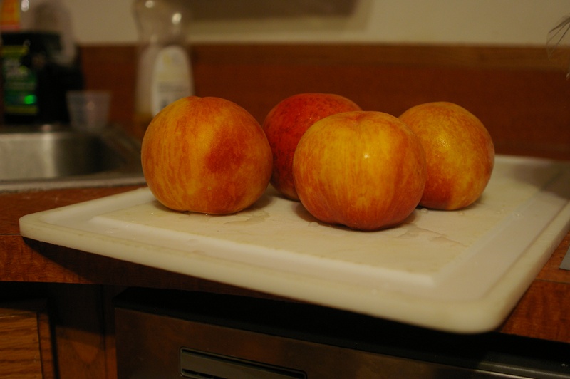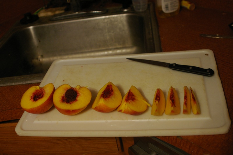 Towards the end of that hour, slice the peaches. There should be a sort of pointy line pushed out of the side of the peach, if you cut along that and go all the way around, they should pull apart pretty smoothly. Cut each of the resulting halves into 8 slices.