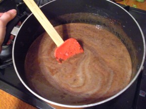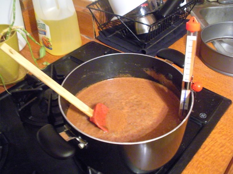 This will seem to take a very long time, but all you have to do is stand there and stir. If you bring your laptop/tv/ipod into the kitchen, you’ll be fine. Once the mixture reaches 235, pour it into the prepared pan and spread it evenly. Mine pretty much spread itself fine.