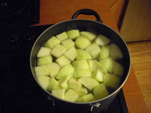 Prepare the filling by bringing a large pot of water to a boil. While that heats, peel the potatoes and apple and cut into large chunks.