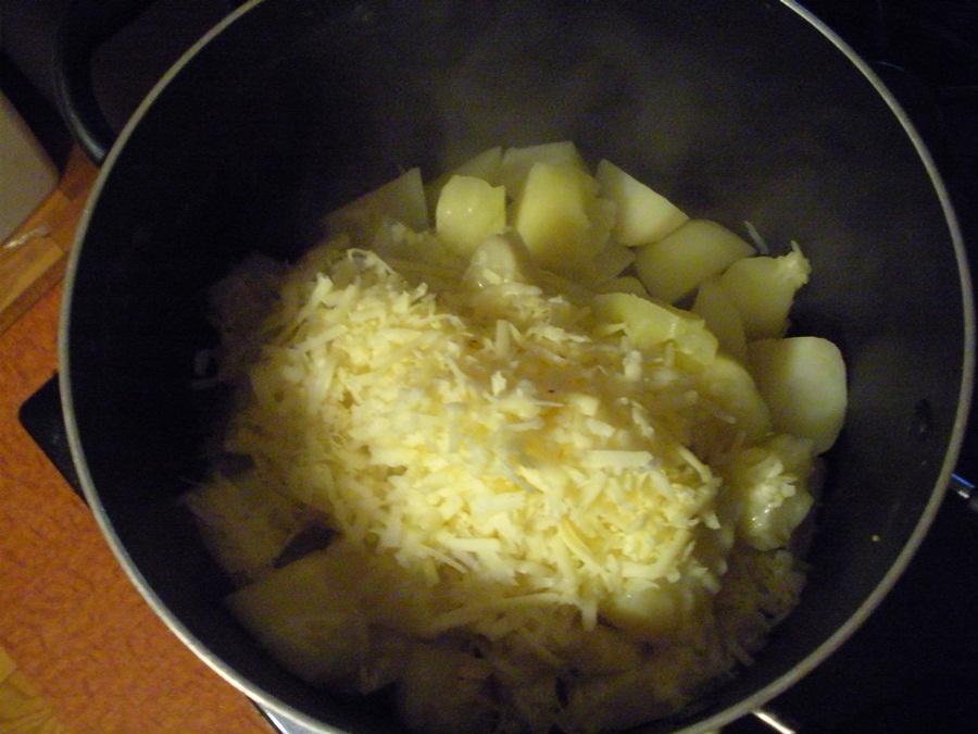 To make the filling: Set a large pot of water on the stove to boil. Peel and roughly chop potatoes and apples. Boil until soft. Drain, then add cheese and butter. Mash until smooth, add salt and butter to taste.