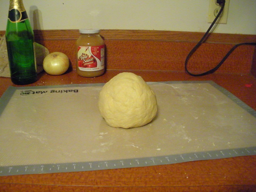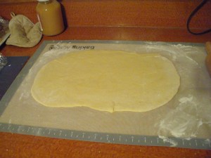 To prepare the dough, mix the flour and salt. Beat the eggs and add to the flour and stir. Add the sour cream and butter and stir together, then turn out on a lightly floured surface and knead. The mixture was dry for most of the time I was kneading, but as the last bits got incorporated it became sticky. Continue kneading until it loses most of its stickiness.