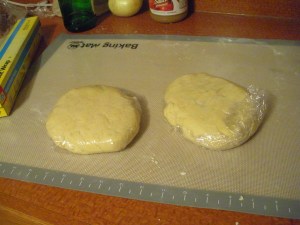 Divide the dough into two even portions and form each into a disk. Wrap in plastic and refrigerate for half an hour. You can also do this in advance and leave the dough in the fridge for up to two days.