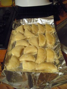Freeze at this stage, or put as many of the pierogies you’ve made in the pot of water as fit without overlapping, and continue making more pierogies while they boil, using both halves of the dough. The pierogies will be done when they float, 8-10 minutes. Give them a quick stir once 2 or 3 minutes in so that you know they’re not stuck to the bottom.
