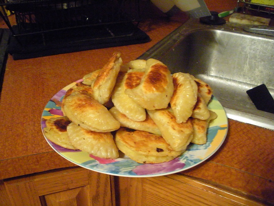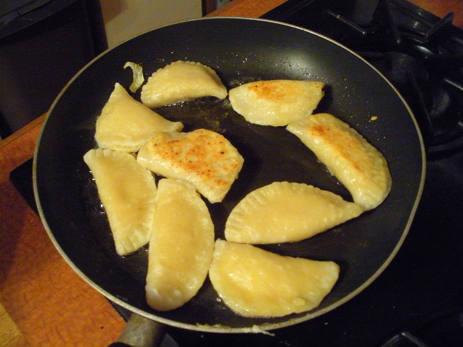 Preparing the pierogies: Heat a pot of water on the stove. Roll one portion of the dough out to 1/8″ thick. Cut out 2″-3″ circles and put small portions of the filling on them. Fold dough over to form half-circles, and seal shut by crimping with a fork. Boil prepared pierogies while continuing to make more. When pierogies float, take them out and rinse them under cold water, then set aside to dry.