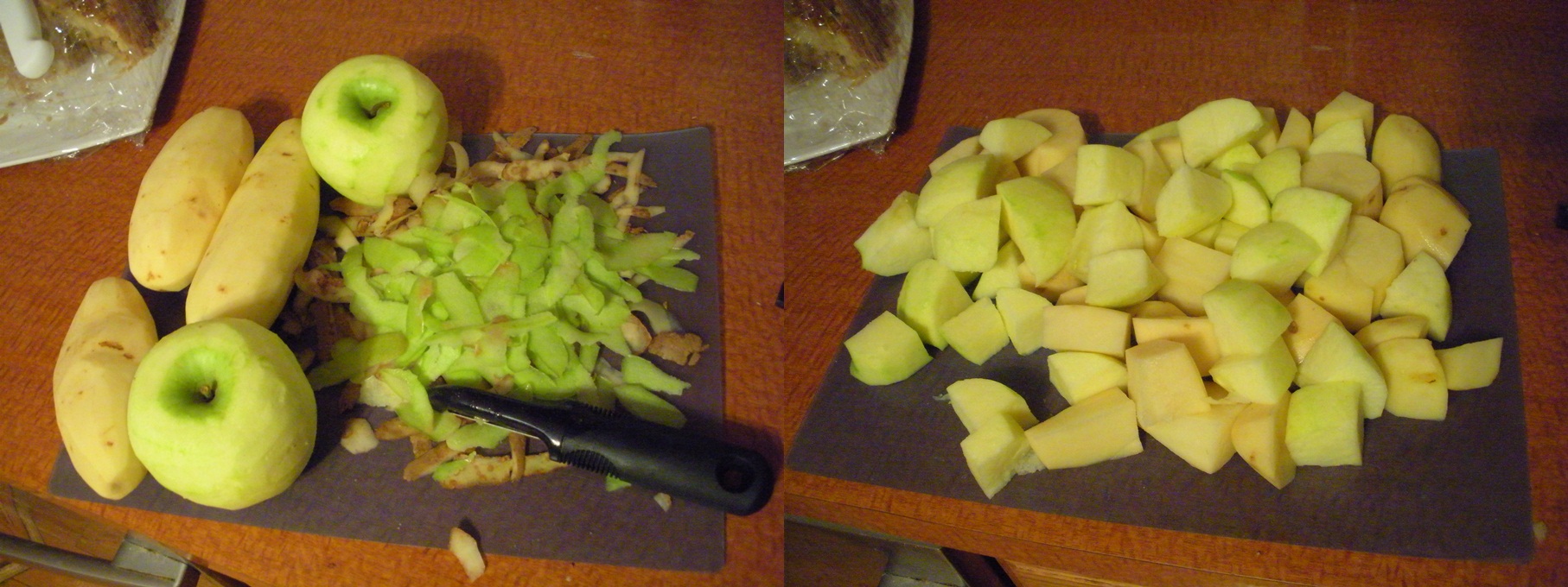 Put the chopped pieces into the boiling water. The apples will probably float, while the potato pieces sink.