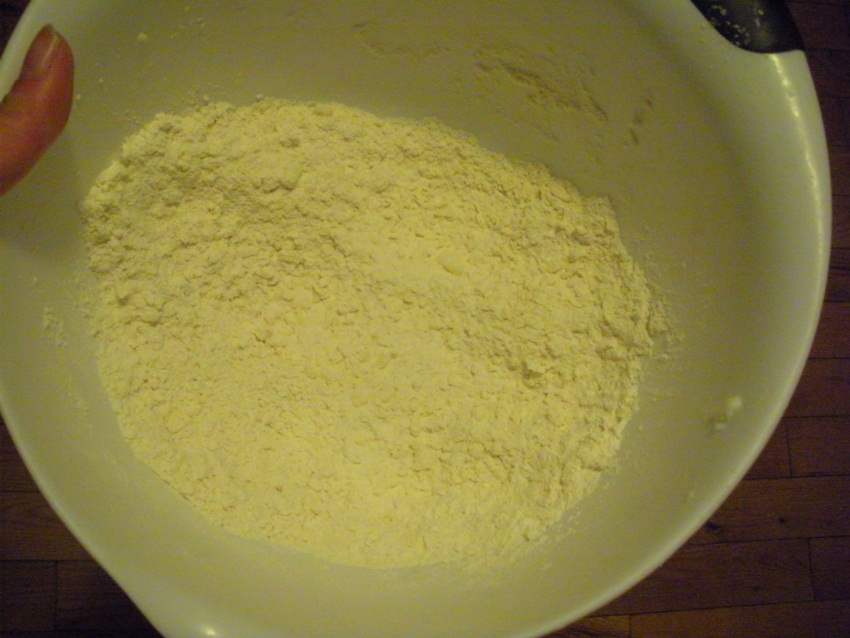 Start the crust by whisking together the flour and salt. Work the shortening in with a pastry blender or your fingers until well combined. Work the butter in until the mixture is unevenly crumbly, with some butter pieces still a bit larger than others.