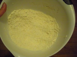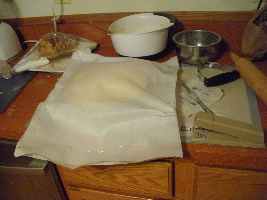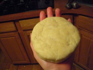 Add the water one tablespoon at a time, stirring as you sprinkle. When the dough is moist enough that it holds together when squeezed, stop adding water and knead it three or four times to bring it together. I just did this in the bowl so I didn’t have to clean another surface, and it worked fine. Pat it into a thick disk, then roll the edge of the disk on a counter to smooth out the edges. Wrap in plastic and refrigerate for 30 minutes or overnight. I did this much at 11:30pm, then got up at 5am to finish the pie so I could bring it to work. Oof.