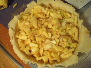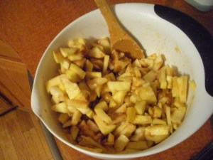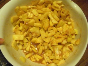 When you’re ready to make the filling, preheat the oven to 425 degrees. Put all the filling ingredients into a big bowl and stir. I found out at 5am I didn’t have lemon juice, so ended up just replacing it with more apple juice concentrate, and nothing exploded, nor did the apples get overly browned.