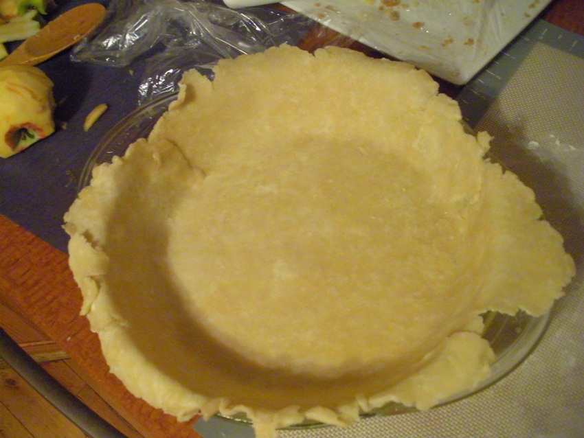 Lightly grease a 9″ pie pan and lay the crust gently into the pan.
