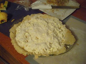 Meanwhile, roll out the dough into a 12 1/2″ -13″ circle. Lightly grease a 9″ pie pan and lay the crust gently into the pan. Spoon the microwaved filling into the crust.
