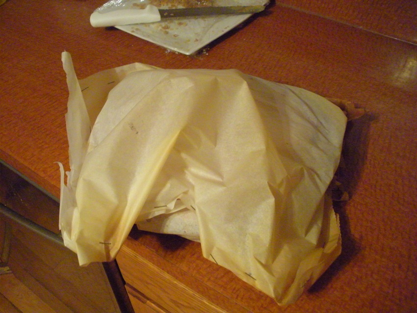 At this point, if you have a brown paper supermarket bag, put the pie in that and staple or paperclip the end shut. If you don’t have a bag, you can just staple two pieces of parchment around the pie. Please, please, don’t use wax paper. If you’re not aware, you’re not supposed to bake with wax paper. It isn’t meant to withstand high heat and will get fumes all up in your baked goods.
