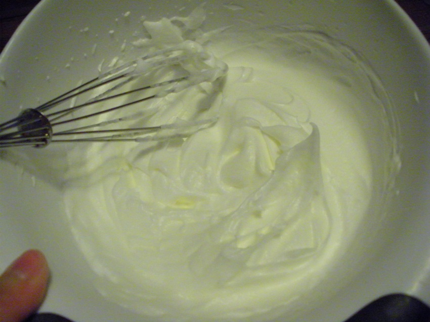 Beat the egg whites in a large bowl until stiff. Beat in the sugar until fluffy, then mix in the olive oil.