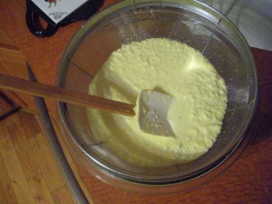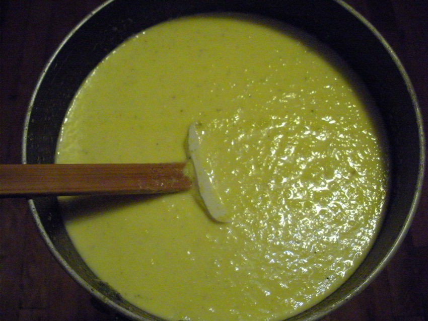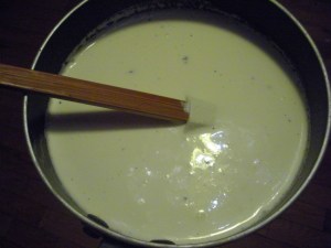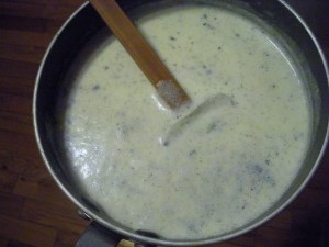 Pour the mixture back into the warm pot and cook gently on the stove, stirring constantly with a wooden spoon or rubber spatula.
