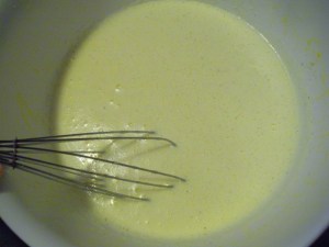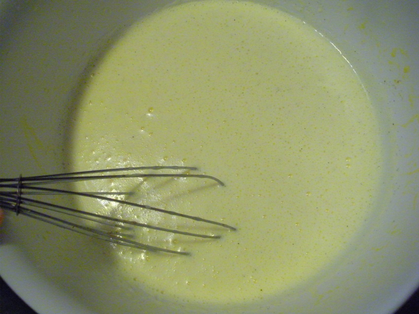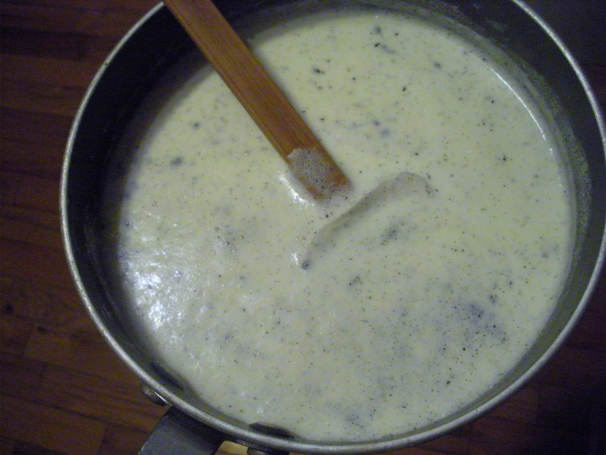 Remove the vanilla bean from the milk mixture. Ladle a bit of the warm milk into the yolks, whisking as you do so.