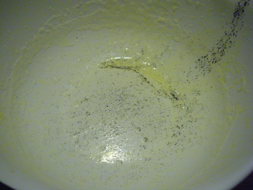 Prepare the vanilla bean by cutting down the length of it, opening it on one side. Scrape the seeds  out and put them in a saucepan.