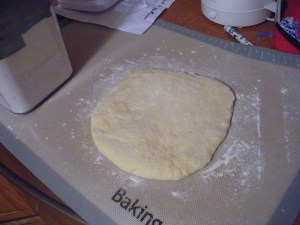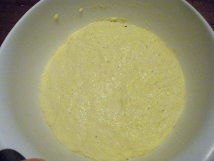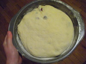 When you’re ready to use the dough, grease a cast iron pan (or cake pan if you don’t have one) with the butter/lard/bacon grease. Sprinkle the surface of the dough with flour, then shape it into a ball in your hands by stretching the surface of the dough around to the bottom on all four side, rotating the ball a quarter-turn as you go. Flatten the ball to 1/2″ thick with your hands.