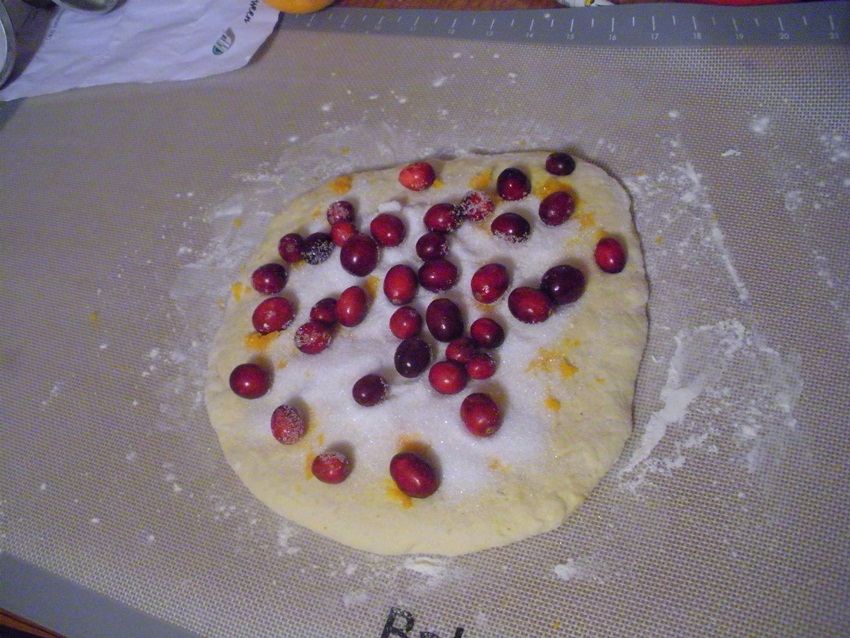 Sprinkle the sugar and orange zest on the dough, and scatter on the cranberries.