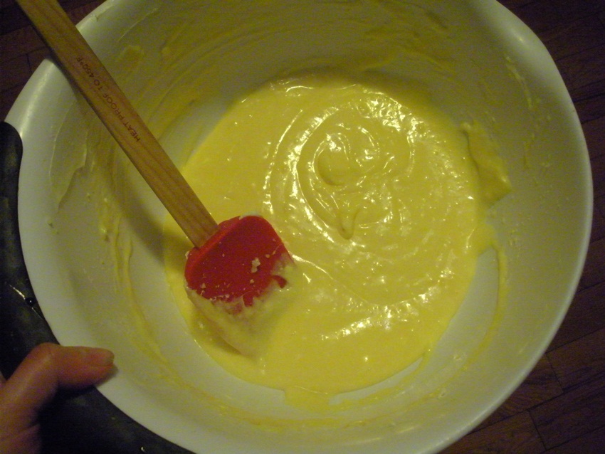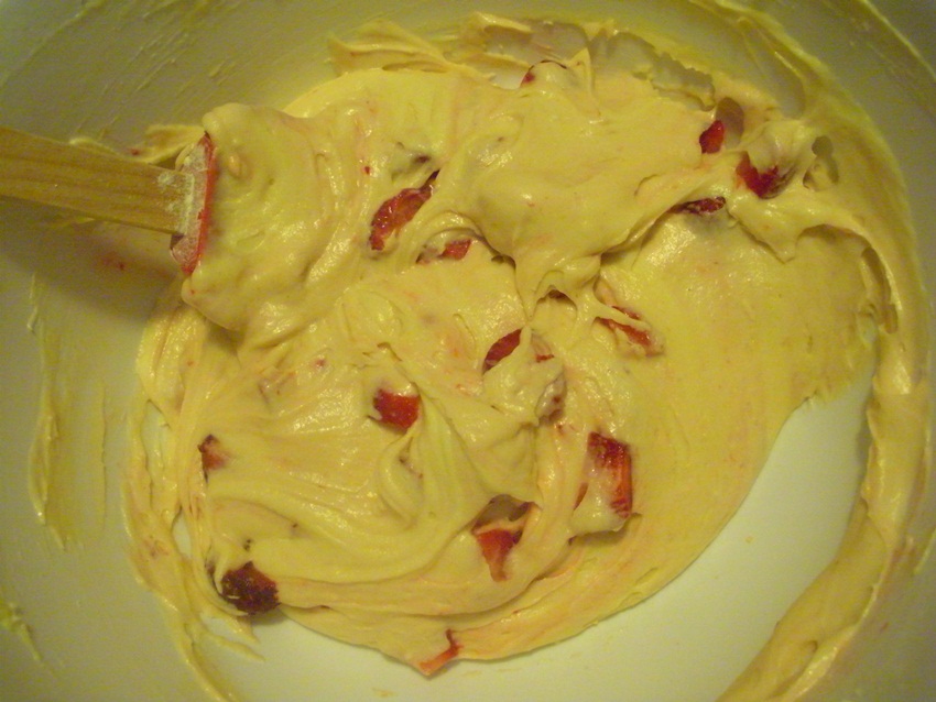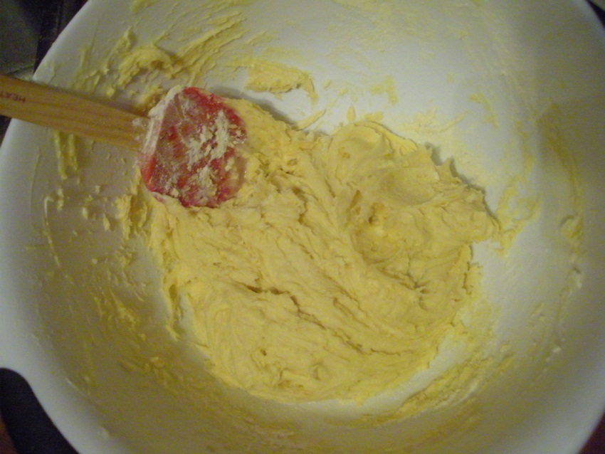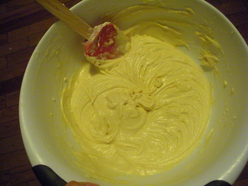 Cream the butter, sugar, and cream cheese until fluffy. Add the eggs, beating after each, then the vanilla.