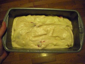 Grease and flour a 9X5″ bread pan. Preheat the oven to 350 degrees.