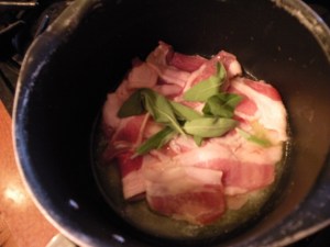 Heat a saucepan until medium hot and add the butter, sage, and half of the pancetta or bacon.