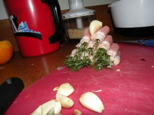Slice the remaining pancetta or bacon in half and slice one or two of the garlic cloves until you get 12 small slivers of garlic. Place a sprig of rosemary and a sliver of garlic on one end of a piece of pancetta or bacon and roll it up, repeating with each.