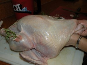 Microwave the orange for 30 seconds to make it hot and then stuff it into the cavity at the other end of the turkey. Weigh the stuffed turkey and calculate the cooking time – 20 minutes per pound.