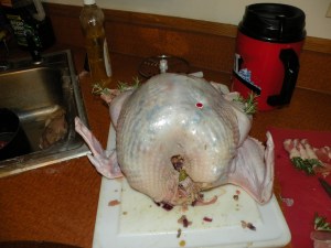 Wipe the turkey down with paper towels, inside and out. Stab the thighs and drumsticks in six places on each side and push the pancetta/bacon roll into the hole until it just barely sticks out. I had accidentally bought thickly sliced bacon, so it was fairly difficult to cram in, but we made it work!