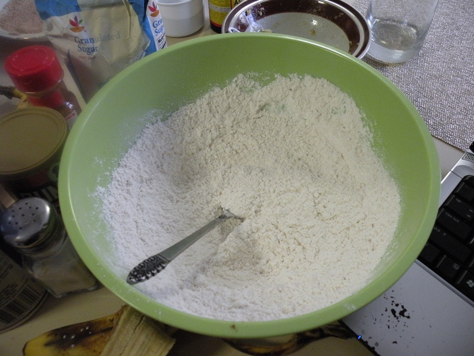 Mix the liquid mixture into the dry goods until just evenly moistened.