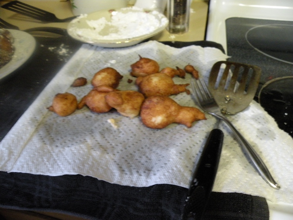 Pull the cooked beignets out and let them drain briefly on paper towel.