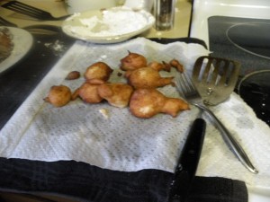 Working several at a time, drop rounded teaspoonfuls of batter into the hot oil and fry until golden brown, about 15 seconds per side. Remove and drain briefly on paper towel.