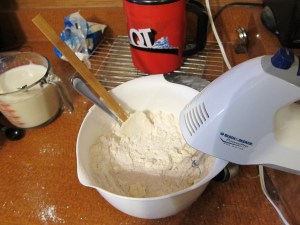 In a large bowl, mix the cake flour, sugar, baking powder, and salt. Stir together well. Add the butter and shortening and mix for thirty seconds, until well combined.