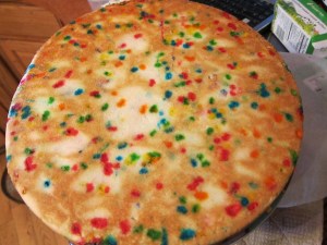 Scrape down the sides of the bowl, then add the egg mixture in 3 or 4 batches, mixing between each. Mix another minute. Gently fold in the sprinkles.