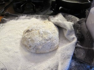 Dust a kitchen towel well with flour. Wet your hands and shape the dough into a ball. Set the dough seam-side down on the towel. Fold the towel over the dough and let it rise another 2 hours.