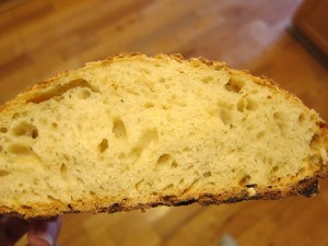 I’ve had this bread bookmarked for ages, but it’s supposed to be cooked in a dutch oven, which I didn’t have. My roommate Alex brought one home recently, so I was finally able to check it out. This particular dutch oven is a huge, heavy, cast iron beast, so it was a bit of a challenge to swing in and out of a hot oven, but the bread was worth it! Other than heaving a huge pot around (and you may have a lighter, enameled version…), it’s super simple – doesn’t even require kneading, and it smells and tastes great.