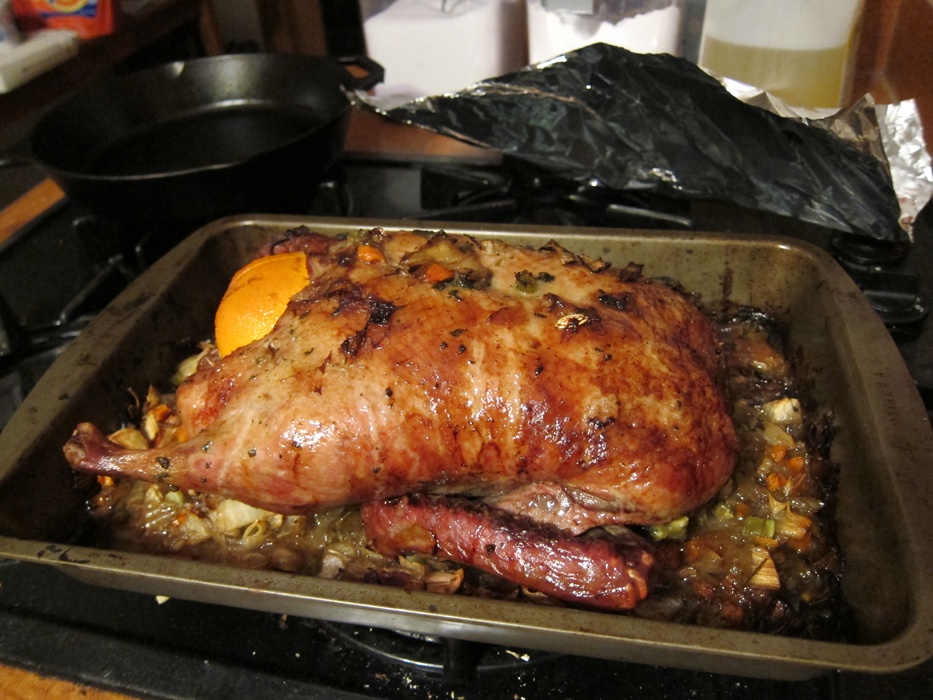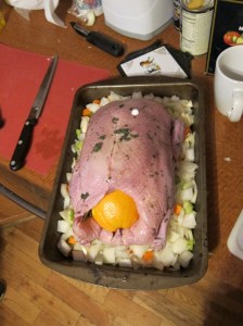 Having a roommate around is ideal to do some of the boring the veggie chopping while you start preparing the duck. Oh, and speaking of duck preparation, just because a duck is smaller than a turkey doesn’t mean it defrosts fast. Ours had two days in the refrigerator and was still a block of ice when I took it out to cook, so be sure to plan ahead and defrost well!