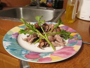 Shred the meat onto plates, serve with a bit of watercress on top, and the plum chutney. I…may have taken the ‘shred’ instruction a bit too seriously, as I have horrible knife skills and everything got slippery in duck fat.