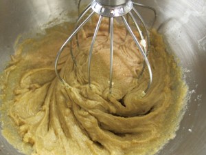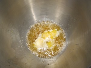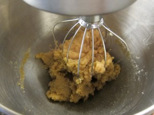 When the butter has has time to cool, add the remaining 1 3/4 cups of brown sugar and the salt, then scrape down the sides of the bowl.
