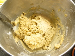 When the butter has has time to cool, add the remaining 1 3/4 cups of brown sugar and the salt, then scrape down the sides of the bowl. Mix well, then add the egg, yolk, and vanilla. Mix well, then scrape down again. Add the flour mixture and blend until just combined. Stir quickly with a rubber spatula to ensure no flour pockets remain.