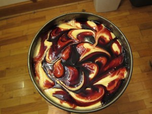 Spread half the batter in the prepared springform. Drizzle half the syrup over the batter. Repeat with the second halves of batter and syrup, then drag a knife through the batter to swirl in the syrup.