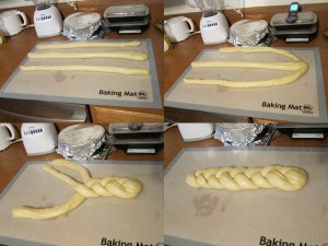 Divide the dough in half, then divide each half into three. Roll each piece into a rope 15-20″ long. Braid into two braids.
