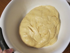 Clean out the bowl, grease it, and place the dough in it, rotating to grease the top too. Cover with plastic wrap and let rise in a warm, draft free place for one hour until almost doubled in size. Punch the dough down, re-cover it, and let rise again for another half hour.