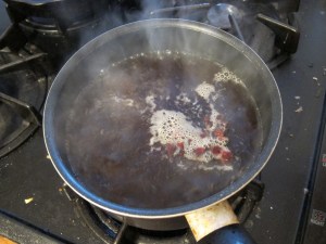 Reheat the water you boiled the eggs in and add the salt, soy sauce, star anise, cinnamon, and tea.