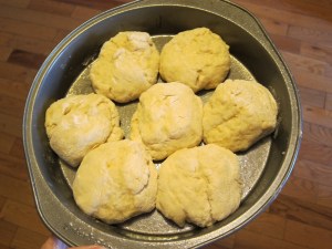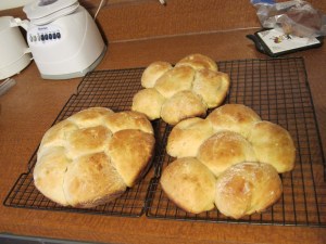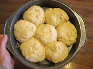 Cover with a damp cloth and let rise in a warm place for one hour. Lightly grease three cake pans. Deflate the dough and turn out onto a well floured surface. Sprinkle the top with flour as well, so that you can handle it without it coating your hands. Divide into three portions. You can do one single loaf per pan, or divide it into smaller buns, that will grow together while they rise and cook, but be able to pull apart to eat.