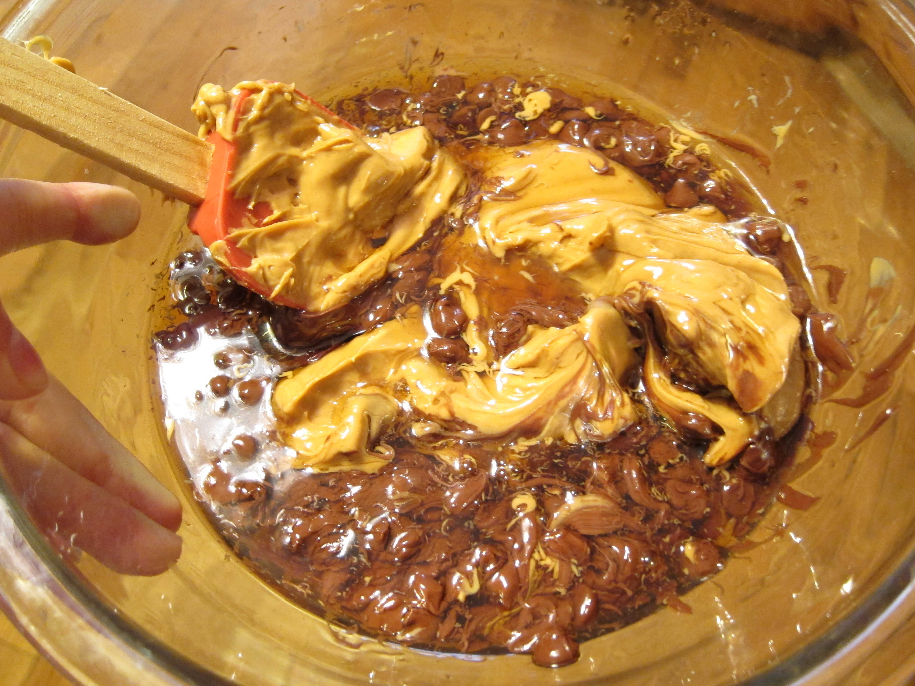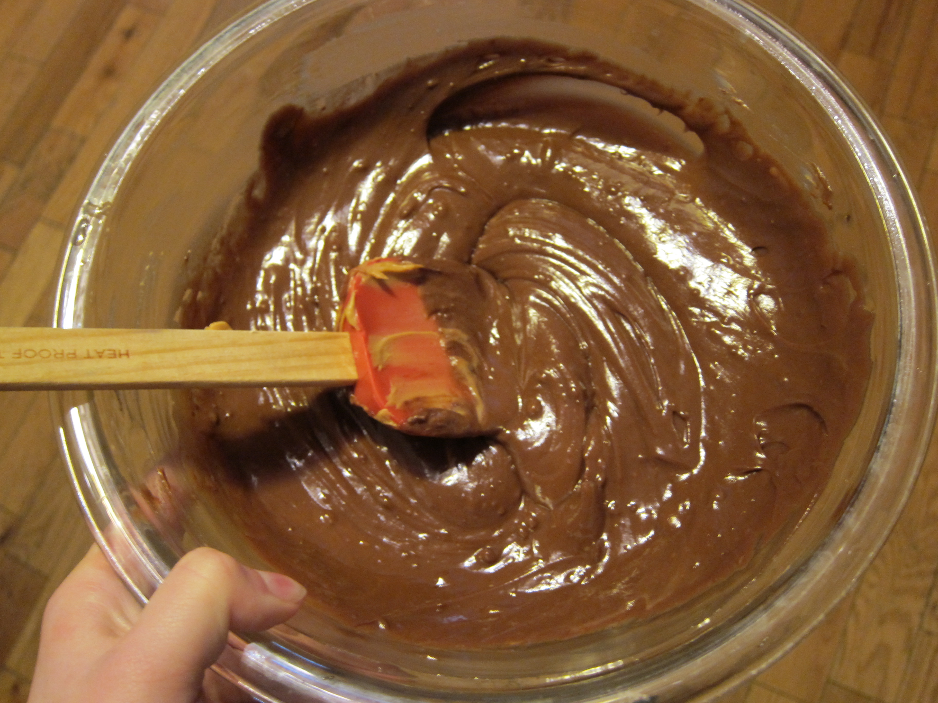 Stir for one minute, then microwave another 40 seconds. Stir for another minute, then microwave again as needed. Mine took about 2 minutes of actual microwaving – the chocolate continues to melt from its own heat as you stir.