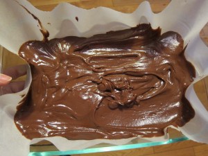 Once evenly mixed, line a small dish with parchment paper. Pour in the mixture and gently smooth the top.