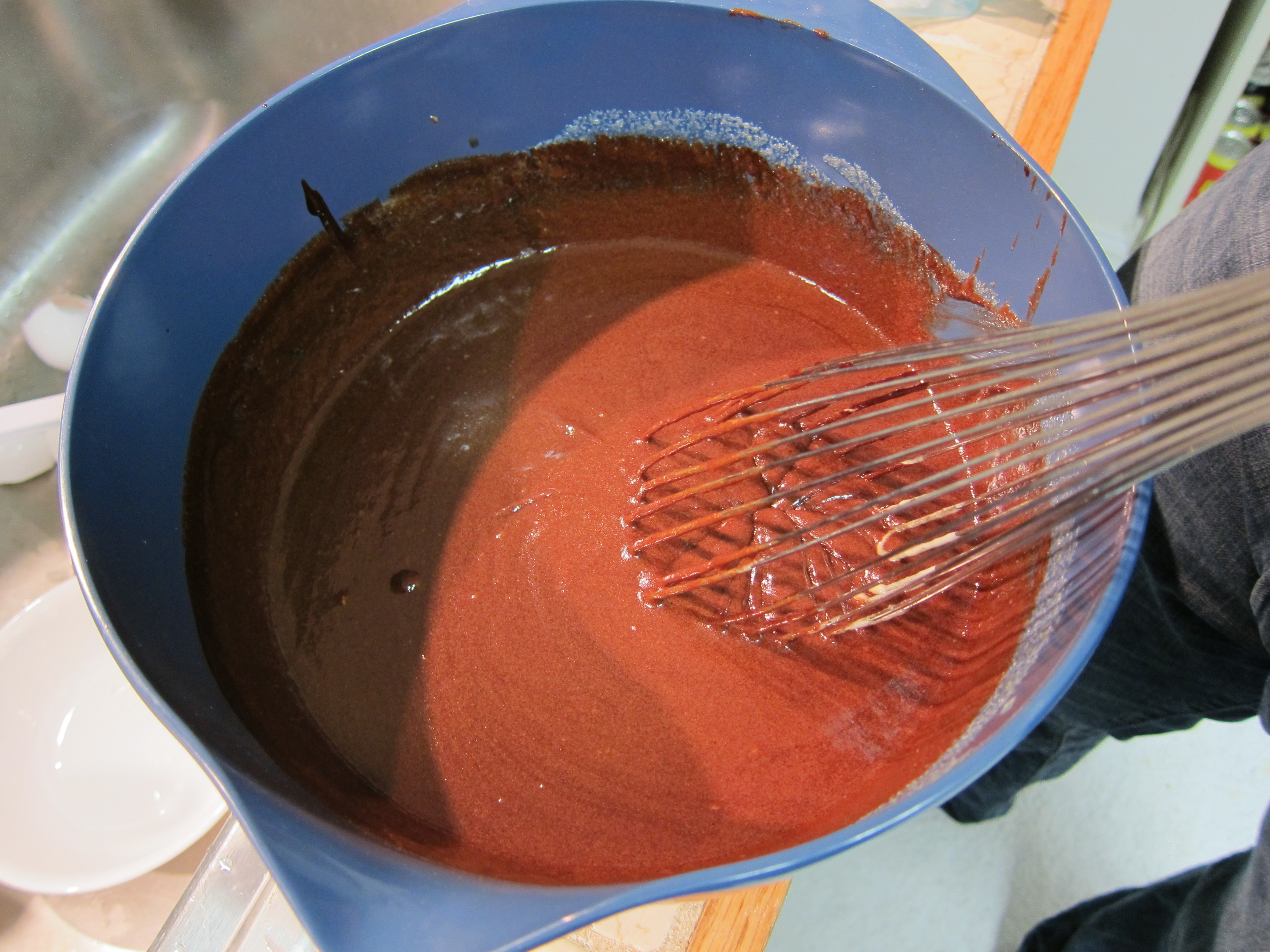 Make the brownie layer by first melting the chocolate and butter in a double boiler or the microwave. Set aside to cool a bit.