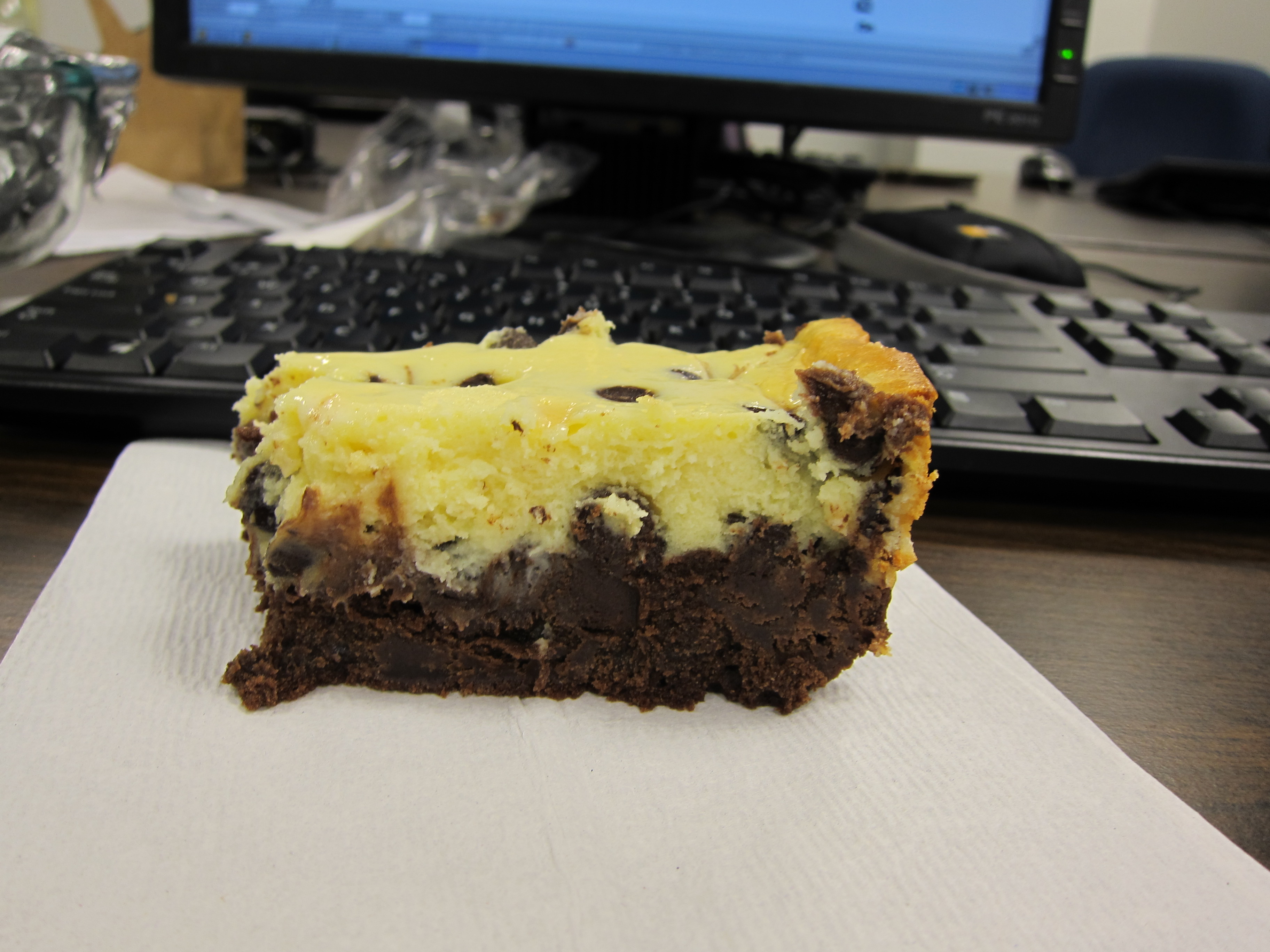 To make the cheesecake half, beat together the cream cheese, sugar, and salt with an electric mixer until light and fluffy. Add the eggs two at a time, followed by the vanilla.