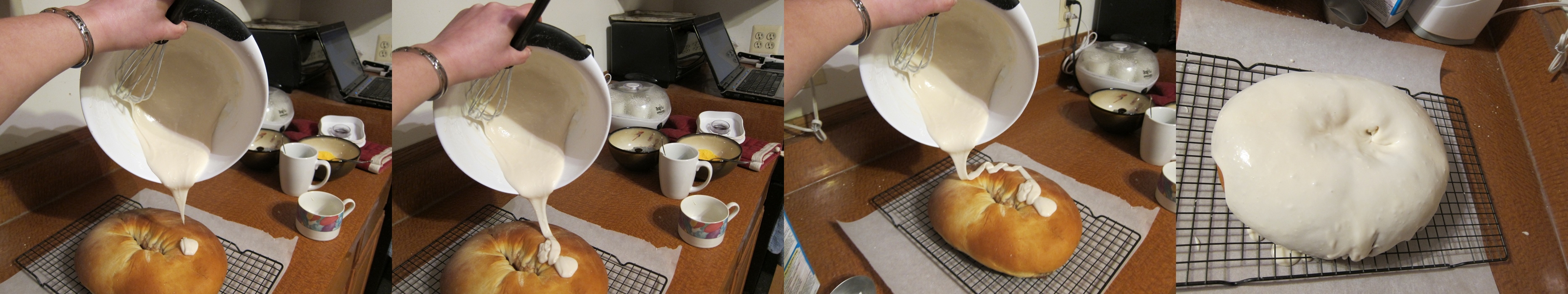 Make the icing by whisking together the powdered sugar, salt, vanilla, melted butter, and milk until smooth.