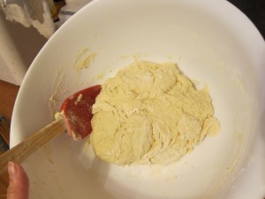 Using an oiled wooden spoon, stir in enough of the remaining flour, adding in small amounts, until you form a soft, tacky dough. This should take about another two cups of flour.