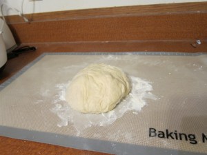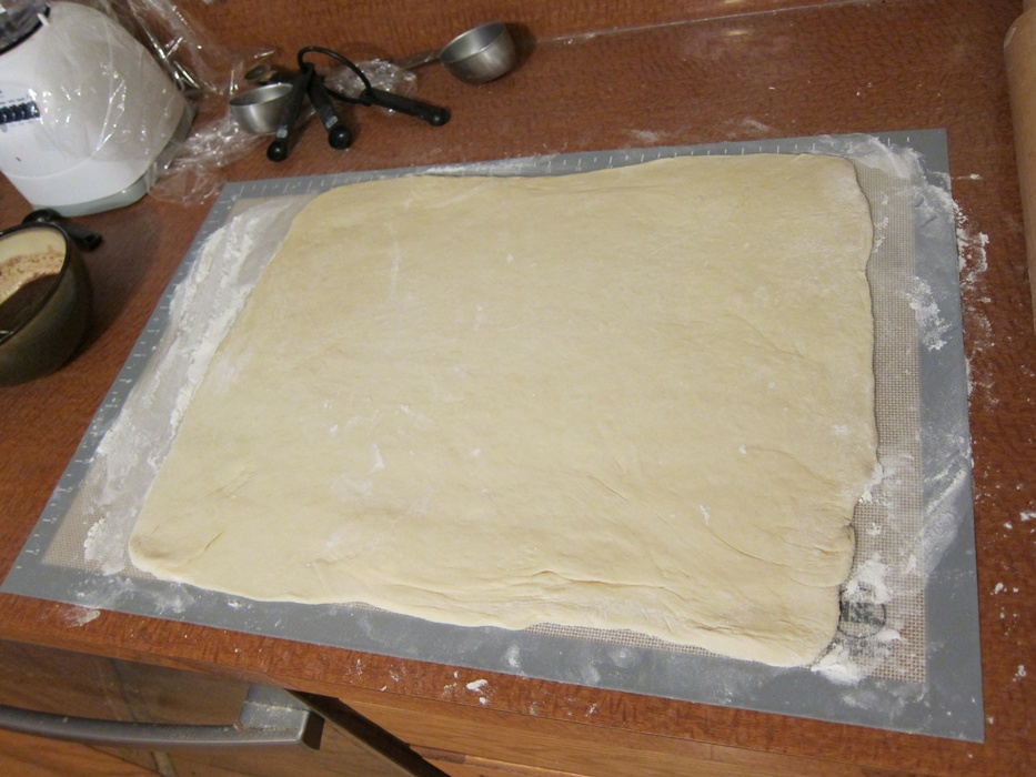 When the dough has risen, knock it down and turn it out on a lightly floured surface. Roll it out into a 18X14″ rectangle. The better you can get the corners now, the better the joint bit will be later.